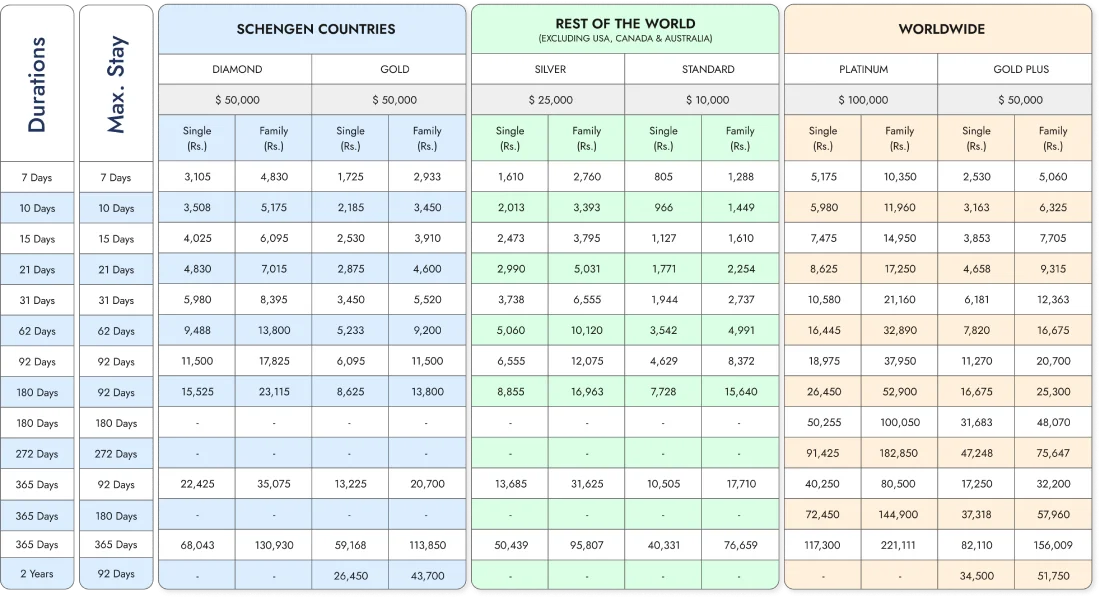 The cost of travel insurance depends on the destination, duration of stay, coverage amount, and whether it’s a single or family plan. Based on available plans: