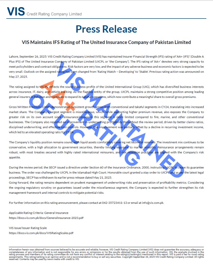 VIS Credit Rating Company Limited (VIS) has maintained Insurer Financial Strength (IFS) rating of ‘AA+ (IFS)’ (Double A Plus IFS) of The United Insurance Company of Pakistan Limited (UICPL or ‘the Company’). The IFS rating of ‘AA+’ denotes very strong capacity to meet policyholders and contract obligations. Risk factors are very low, and the impact of any adverse business and economic factors is expected to be very small. Outlook on the assigned rating has been changed from ‘Rating Watch – Developing’ to ‘Stable’. Previous rating action was announced on May 27, 2025.